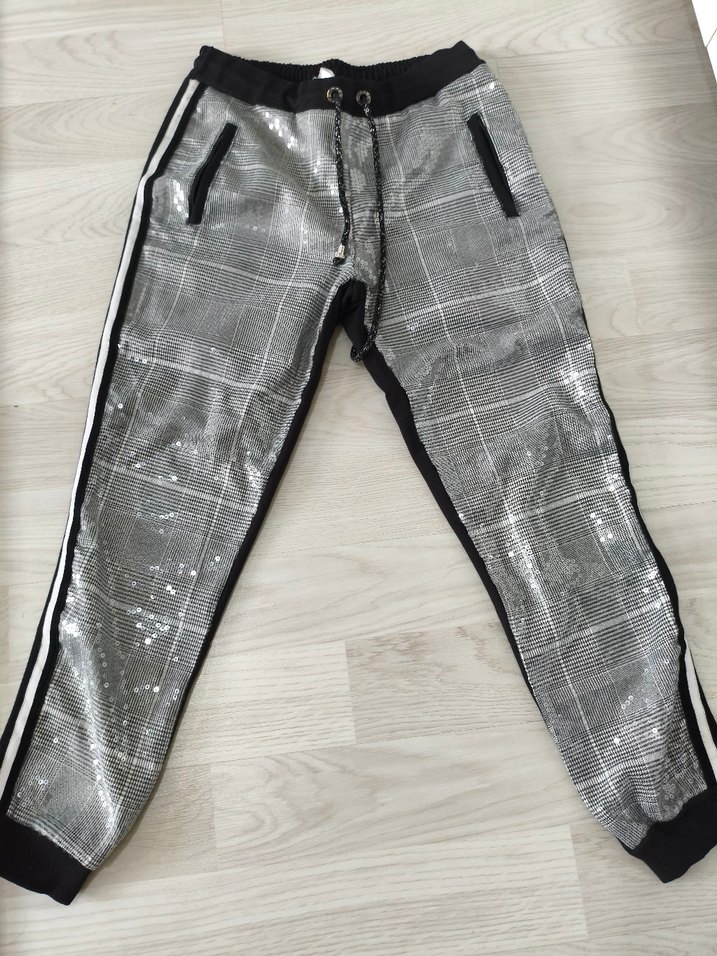 Kadınlar için gri renkte, payet detaylı, midi boy, sentetik kumaştan yapılmış, regular fit eşofman altı. Siyah yan şeritlerle sokak tarzına uygun.
