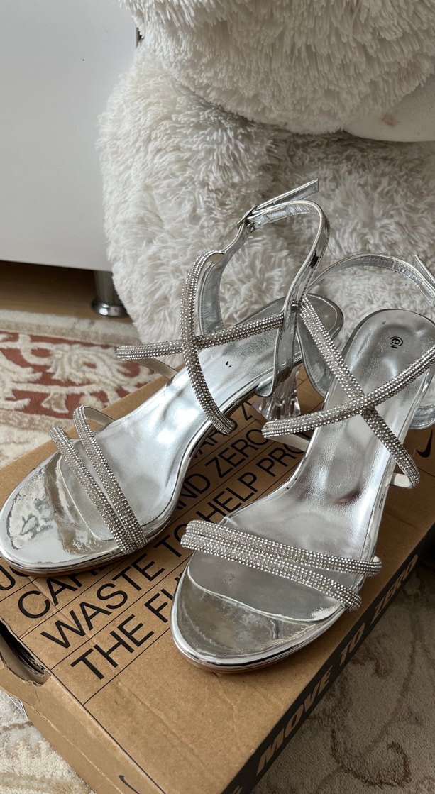 Gri payetli bantlara ve nakış detaylarına sahip, sentetik kumaştan yapılmış kadın topuklu abiye ayakkabı. Düğün ve özel geceler için uygun.