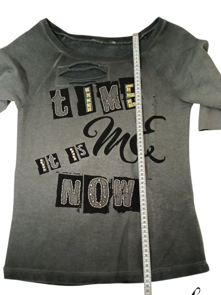 Gri denim kısa kollu, bol kesim, yuvarlak yakalı sweatshirt. Payetli baskısı ve 'TIME it is ME NOW' yazısı ile günlük rahat sokak stili için uygun. ⏰