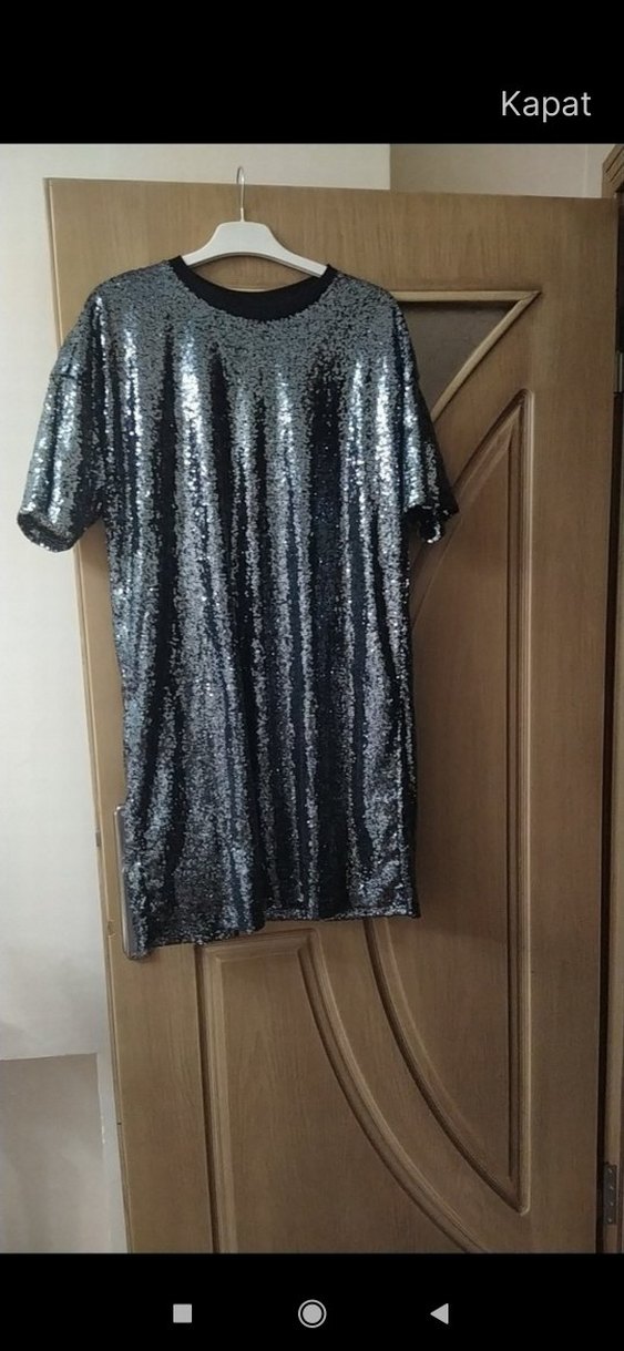 Gri payetli midi boy, kısa kollu, yuvarlak yakalı bol kesim kadın elbise. Parlak dokusuyla partiler için uygundur. ✨