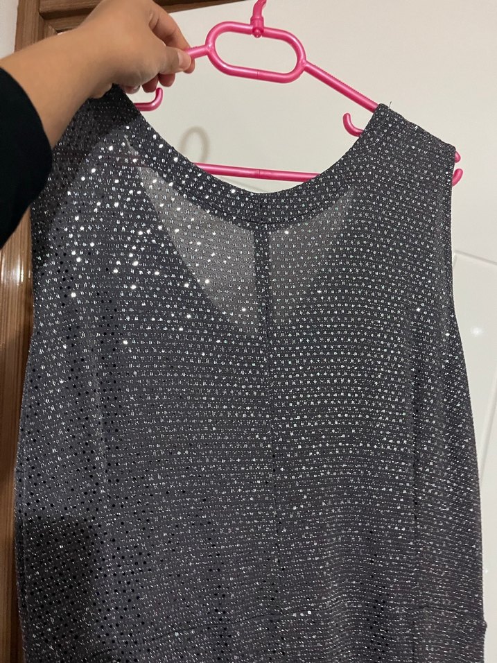 V yaka, kolsuz, vücuda oturan midi uzunlukta, tamamı payetli gri renkli abiye elbisedir. Parti için şık ve trend bir görünüme sahiptir. ✨