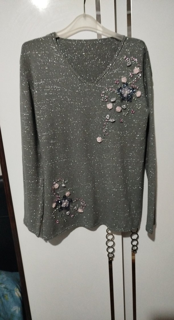 Gri renkli, uzun kollu, yuvarlak yakalı triko. Nakış ve payetlerle süslenmiş, bol kesim ve rahat, modern tarzda günlük kullanım için uygun.