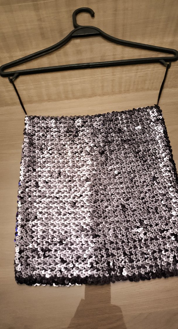 Gri sentetik kumaştan, payetlerle işlemeli, dar kesim straplez 30*30 cm en boy likralı 38 bedene uygun