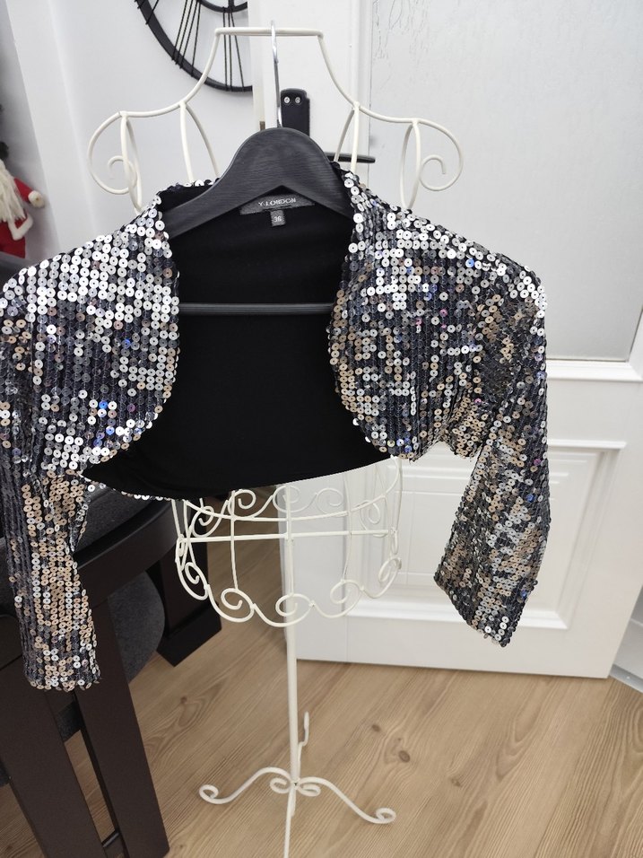 , uzun kollu, gri renkli ve payetlerle kaplı straplez bolero. Sokak modasına uygun şık ve modern bir görünüm sunar. ✨sıfır ürün