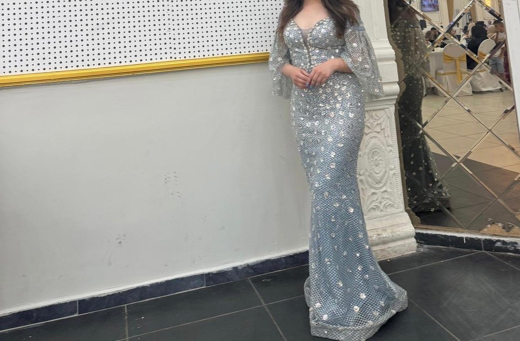 Gri Payetli Uzun Abiye Elbise
