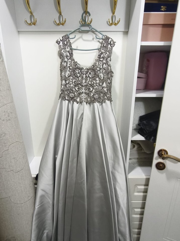 bir defa giyildi. Payet işlemeli, V yaka ve kolsuz, uzun etekli klasik kesim gri abiye elbise, düğünler için uygun.