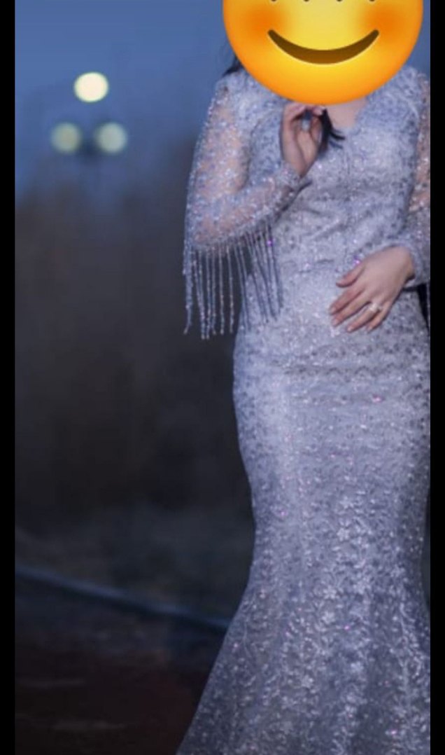 Payetli ve nakış işlemeli, V yakalı ve uzun kollu, klasik şıklıkta gri uzun abiye elbise. ✨