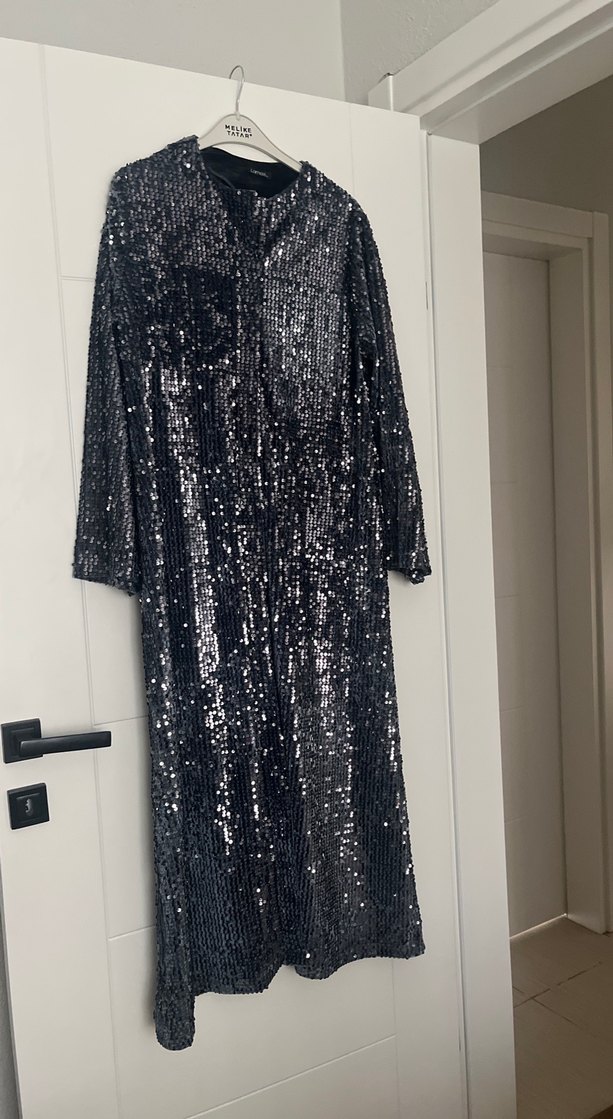 Uzun kollu, payetli ve yılan desenli gri abiye elbise. V yakalı, bol kesim ve gece partileri için uygundur. ✨