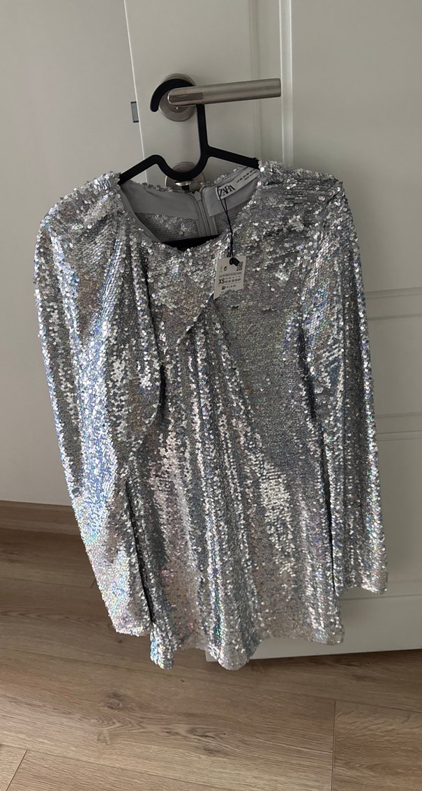 Gri midi elbise, uzun kollu ve yuvarlak yakalı, parlak payetlerle süslenmiş, bol ve göz alıcı bir kesime sahip. Parti ve sokak modası için uygun. ✨