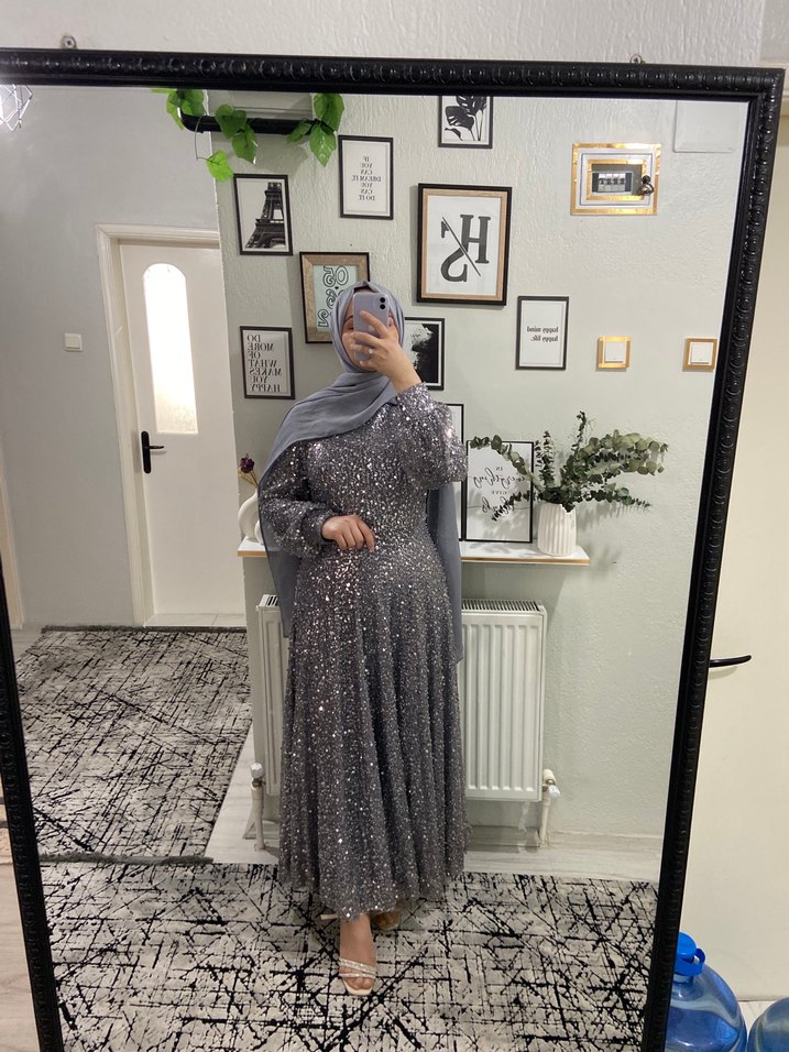 40-42 uyumlu deformesiz arka fermuarlı Uzun ve bol kesim bu abiye elbise, uzun kollu ve hakim yaka detaylarına sahiptir. Gri renk, payetlerle kaplı desenli ve göz alıcı bir görünüme sahiptir. ✨