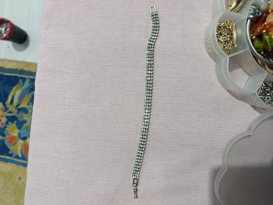 Gri renkli, payetli detaylara ve yılan deseni desenine sahip vintage tarzında bileklik, düğünler için uygun.