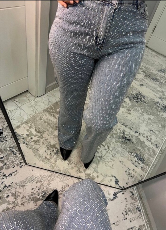 Gri renkte yılan desenli payetli denim kumaştan, regular fit ve midi boyda kadın jean, trend sokak stili için uygundur. ✨