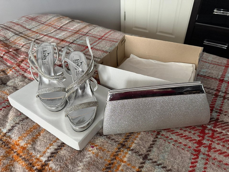 Gri metalik renkte, payet detaylı ve baskılı desenli yüksek topuklu kadın abiye ayakkabılar. Düğünler için şık ve çağdaş tasarım sunar.
