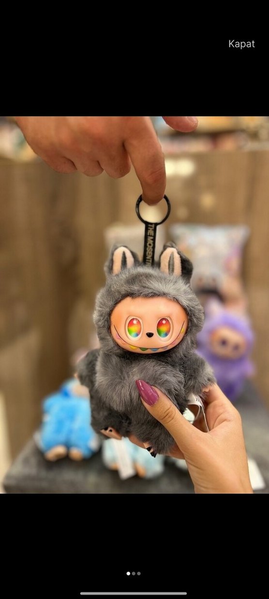 Renkli gözlere sahip, yumuşak tüylü gri peluş anahtarlık oyuncak. Kolay takılabilen anahtarlık halkası bulunur.
