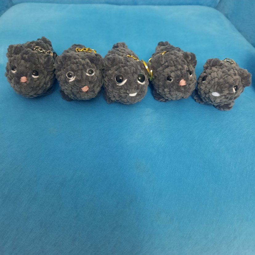Farklı yüz ifadelerine sahip küçük gri peluş oyuncaklar, anahtarlık olarak kullanılır. Yumuşak ve sevimli dokuda.