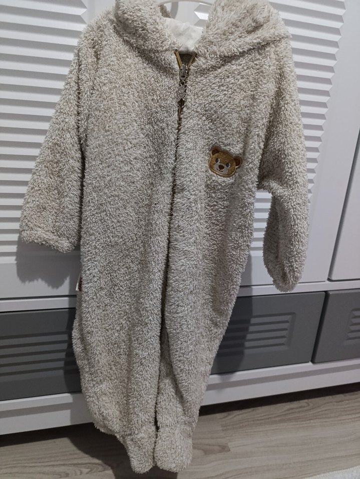 Yumuşak ve sıcak kumaştan yapılmış bek bebek tulumu, kürk detaylı ve ayıcık patchli. Kapüşonlu, desensiz sade tasarım.