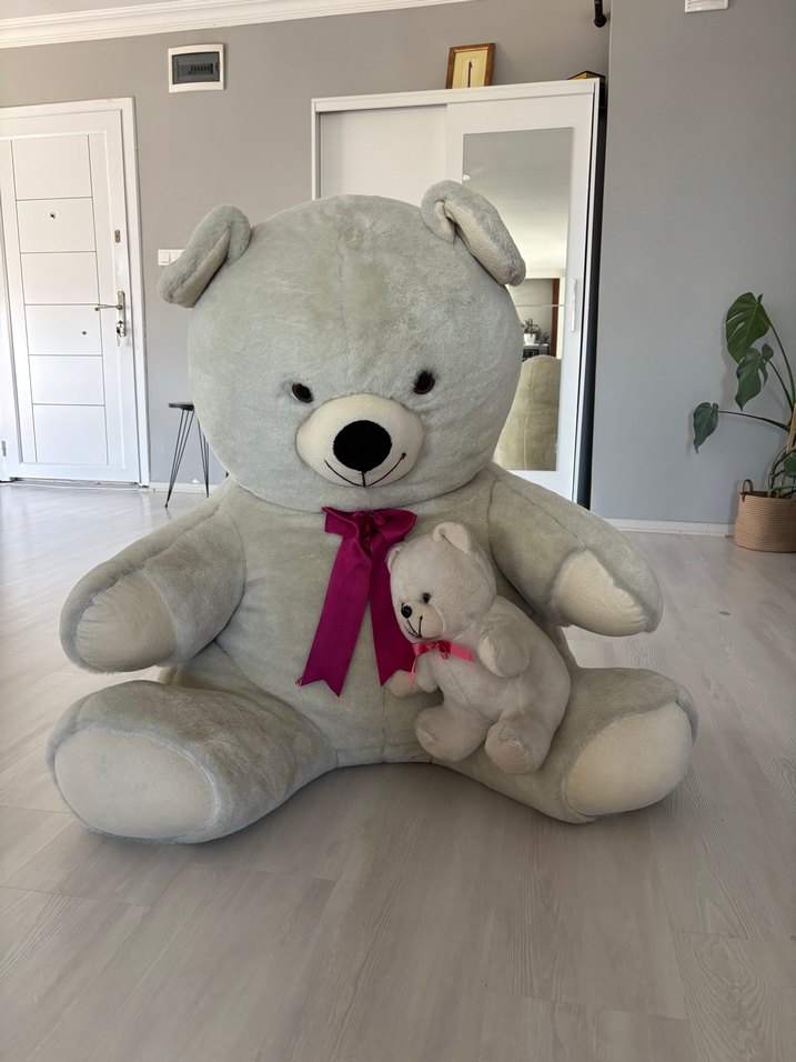 Yumuşak dokulu, üzerinde küçük ayıcık ve pembe kurdele bulunan büyük gri peluş ayı oyuncak.