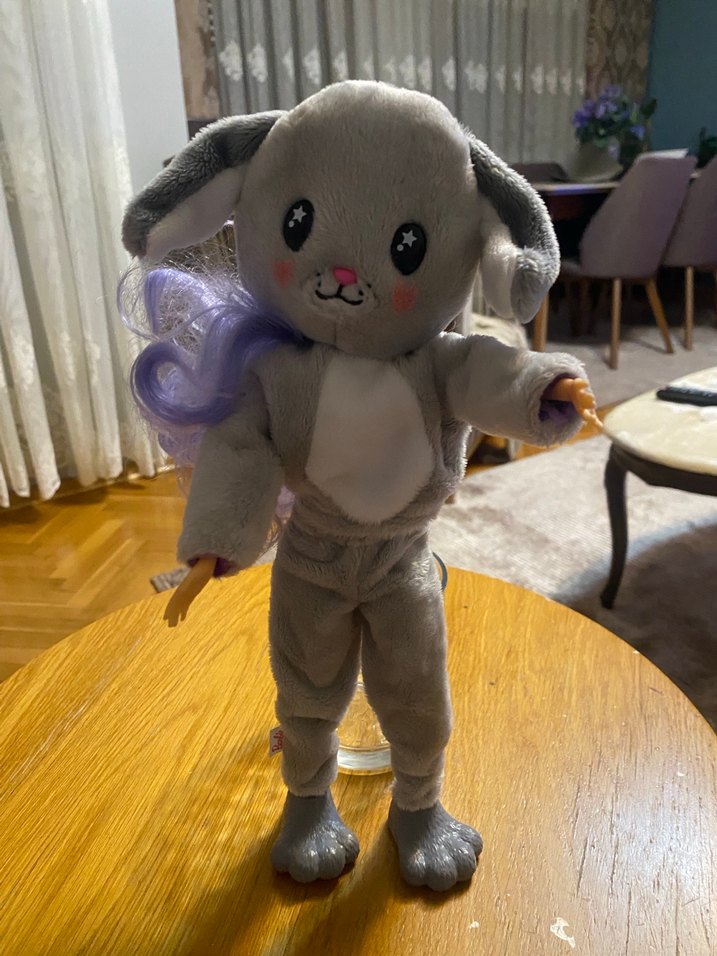 Gri renkli, yumuşak kumaştan yapılmış peluş tavşan oyuncak. Sallanan kulaklar, yıldız desenli gözler ve mor tüylü kuyruğu vardır.