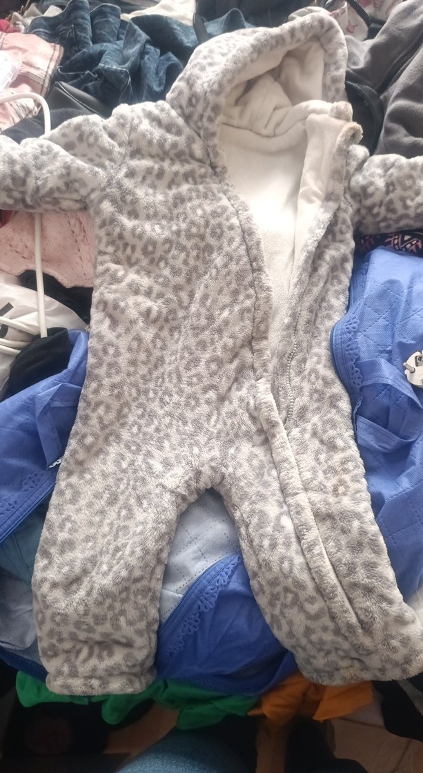 Gri, yumuşak ve sıcak kumaştan yapılmış, peluş detaylı, kapüşonlu ve hafif leopar desenli bebek tulumu. ❄️