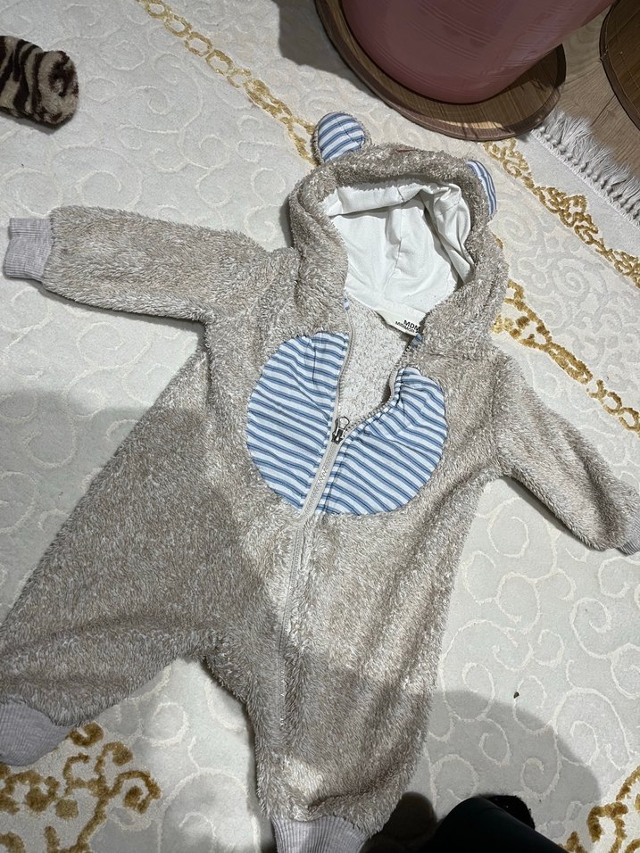 Yumuşak ve sıcak kumaştan yapılmış, kulaklı kapüşonlu gri peluş bebek kar tulumu. Ön fermuarlı ve çizgili göğüs detayı bulunur. ❄️