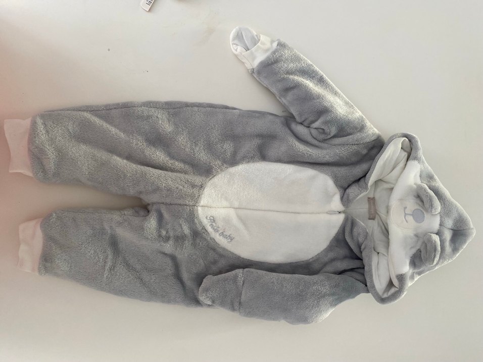 Gri renkli, yumuşak ve sıcak peluş kumaştan yapılmış, kürk detaylı bebek tulumu.