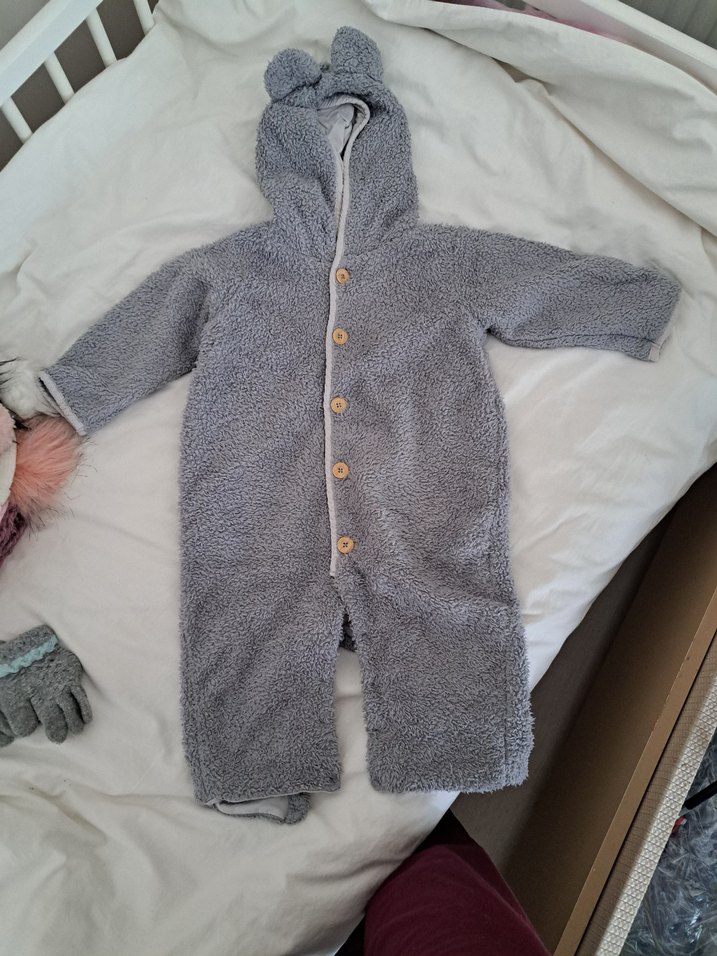 Gri renkte, yumuşak ve sıcak kumaştan yapılmış, kulak detaylı kapüşonlu peluş bebek tulumu. Düğmeli kapama ve sade tasarıma sahip, rahat sokak stili için uygun.