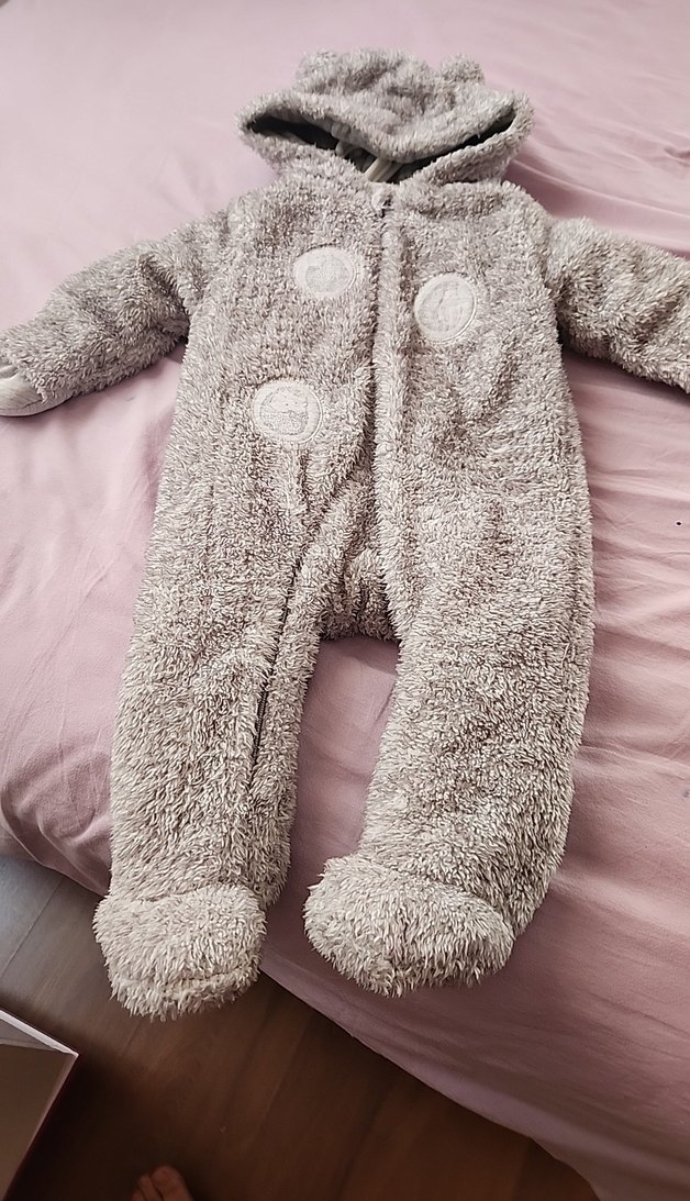 Gri renkli, peluş kumaştan yapılmış, kapüşonlu ve ayaklı bebek tulumu. Yumuşak ve sıcak tutar, kürk detaylara sahiptir. 1 kez giyildi kışlık tertemiz