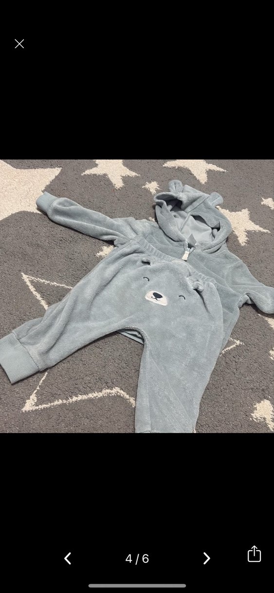 Yumuşak kumaştan gri peluş bebek tulumu, kapüşonlu ve kürk detaylı, sevimli ayı yüzü figürüyle. Street wear tarzında.9.12 ay uygundur