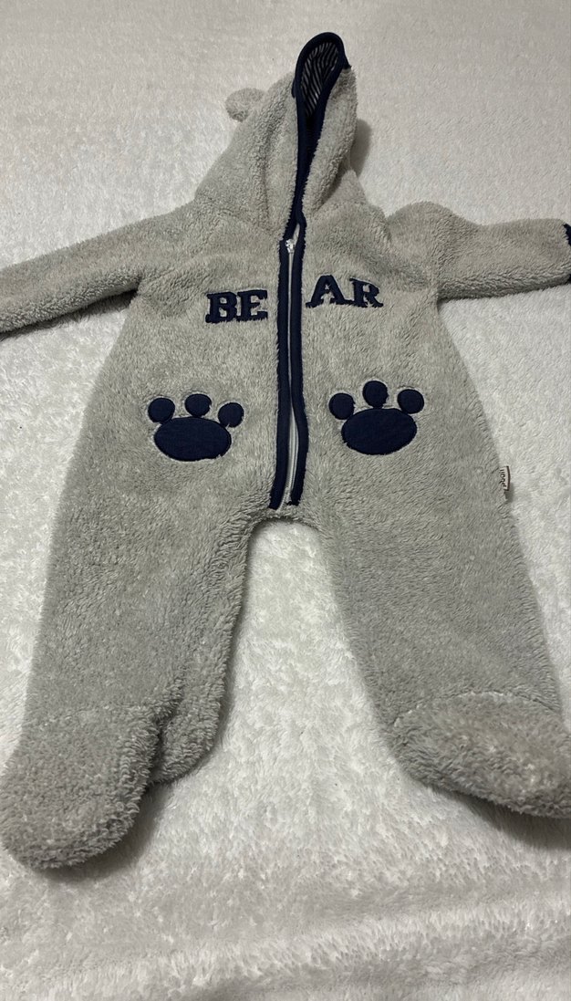 Gri peluş kumaştan yapılmış, kapüşonlu ve kürklü detaylara sahip bebek tulumu. Önünde baskılı pati deseni ve 'BE AR' harfleri bulunur.