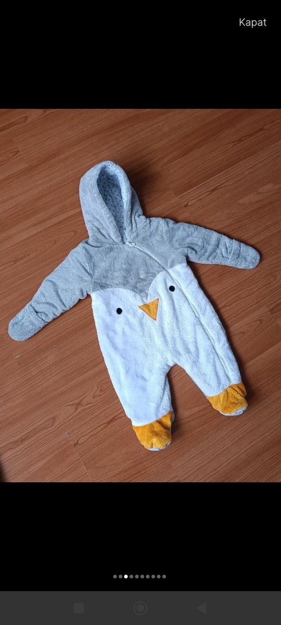Gri renkte, kapüşonlu ve baskılı penguen desenli, yumuşak ve sıcak peluş kumaştan yapılmış bebek tulumu. Ayakları kapalı ve kürklü detaylara sahip. ❄️