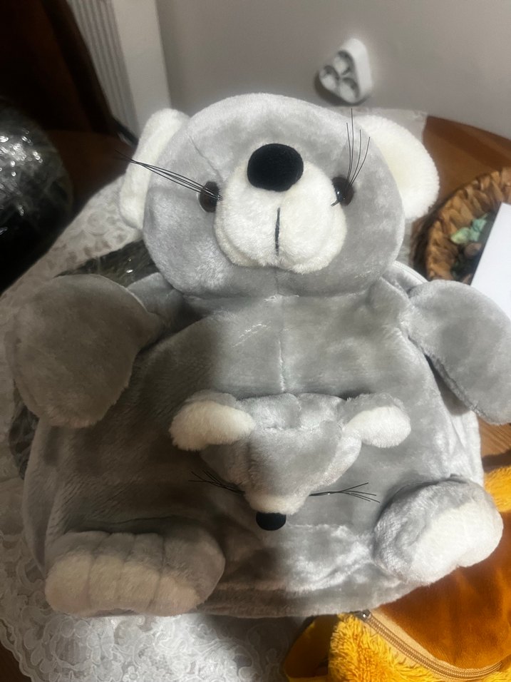 Gri renkte, nakış detaylı ve yumuşak dokulu peluş çanta