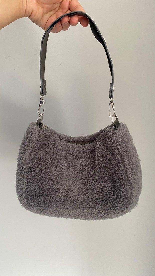 Gri renkli, peluş detaylı kadın çanta, çıkarılabilir askısı ile rahat ve şık bir kullanım sunar.kol kısmındaki yer yapıştırılabilir