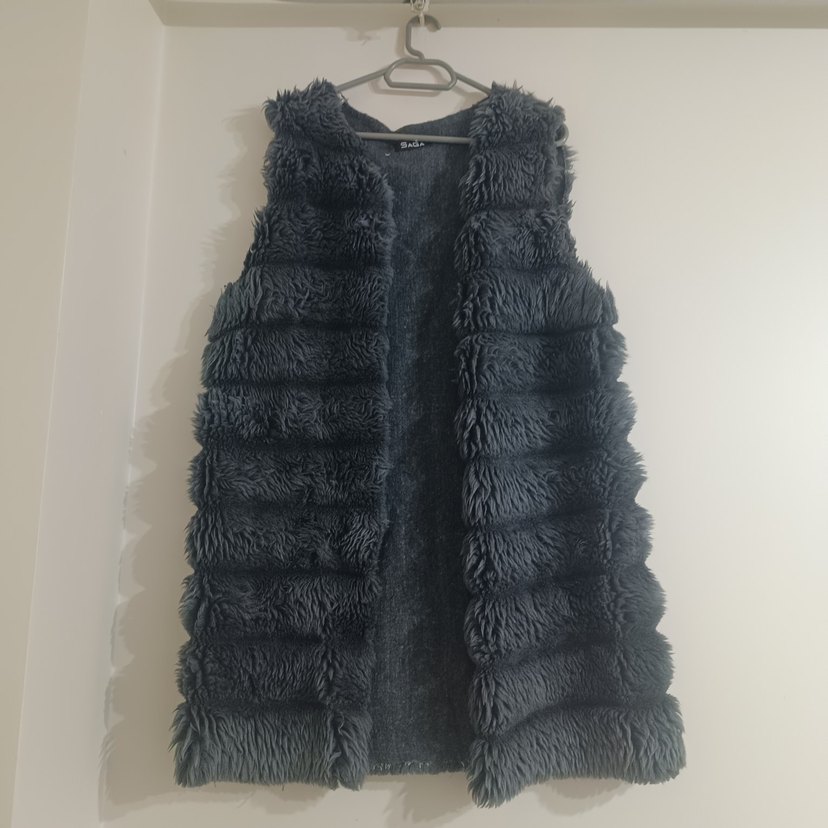V yakalı, peluş detaylı ve fitted kesim gri kadın yelek. Orta boy uzunlukta, rahat ve şık bir sokak stili parçası.