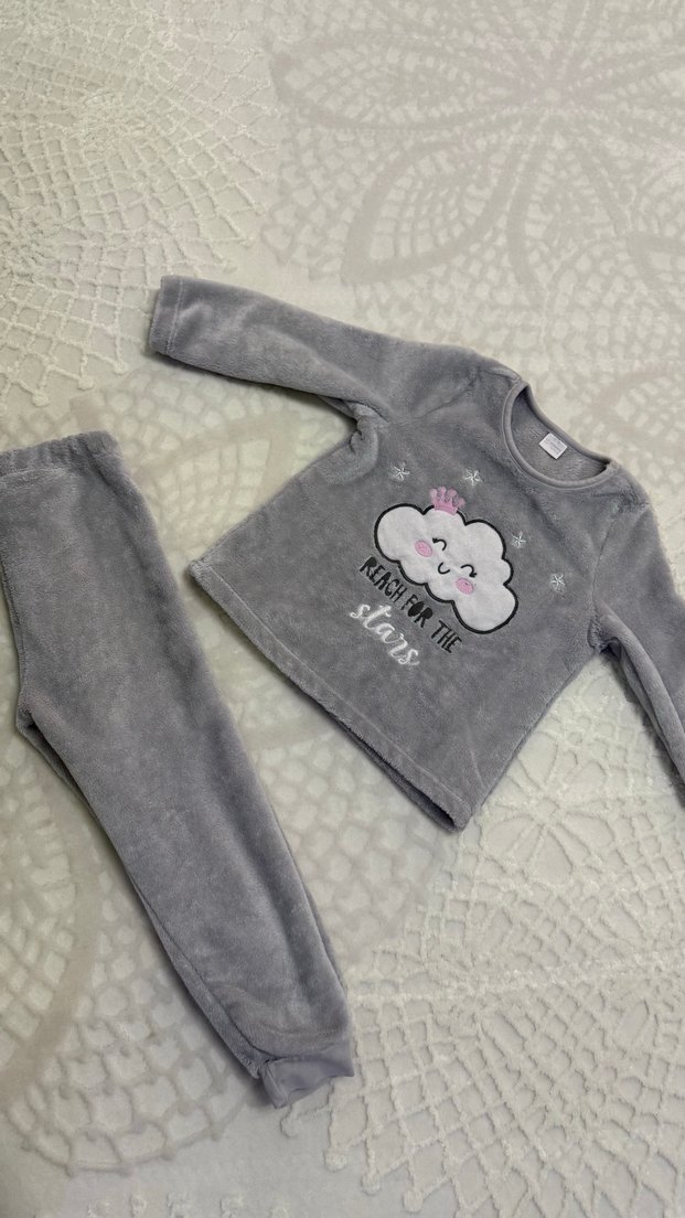 Gri renkli, uzun kollu, peluş detaylı ve baskılı bulut desenli kız pijama takımı. Rahat ve sıcak tutar. ☁️