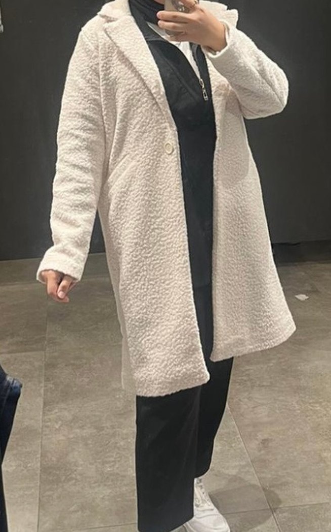 Krem renkte, peluş detaylı midi kaban. Rahat kesimi ve yakası ile günlük kullanıma uygun, uzun kollu ve yumuşak dokulu bir dış giyim ürünü.