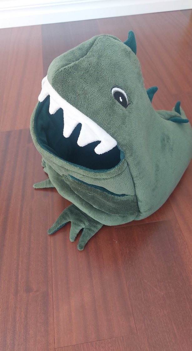 Yumuşak kumaştan yapılmış, detaylı gözleri ve dişleriyle gri peluş dinozor oyuncak. oyuncak koymak icin de kullanabilir ornek olsun diye bir plates topu koydum buyuklugune bakmak icin english homede alinmis olabilir hatirlaniyorum hediyeydi
