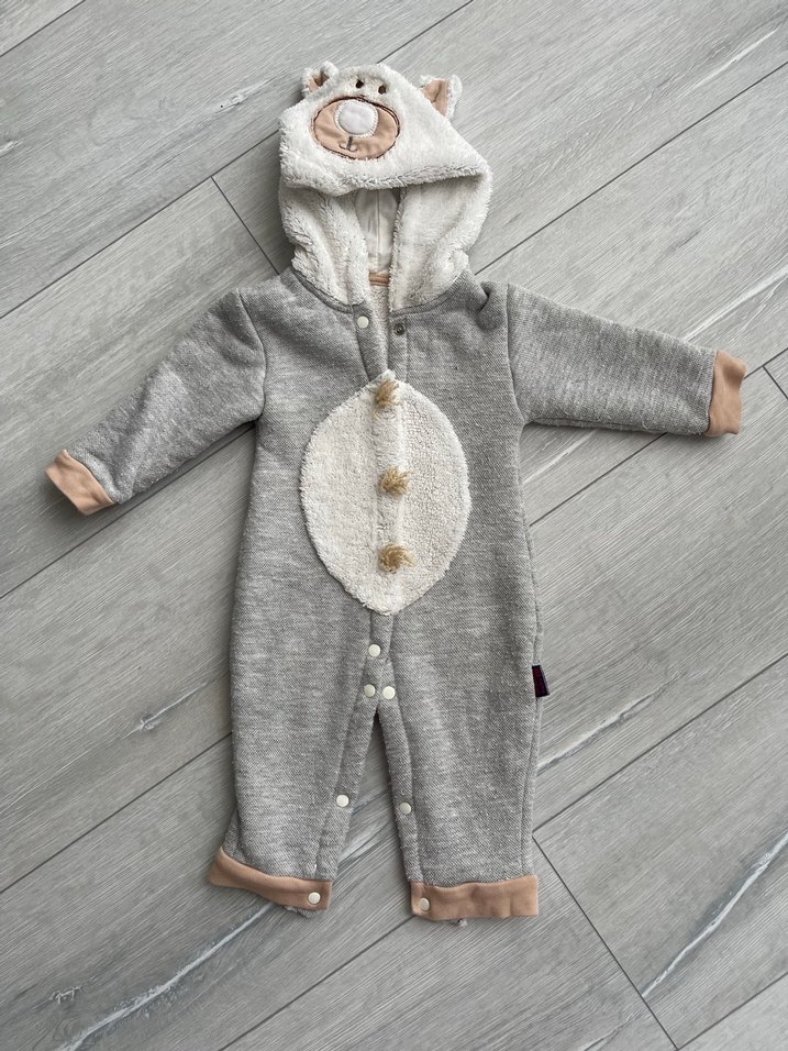 Gri renkli, yumuşak ve sıcak kumaştan yapılmış erkek bebek tulumu. Kürklü detaylar ve nakışlı desenler içerir. Kapüşonunda hayvan kulakları ve çıtçıt düğmeler bulunur.