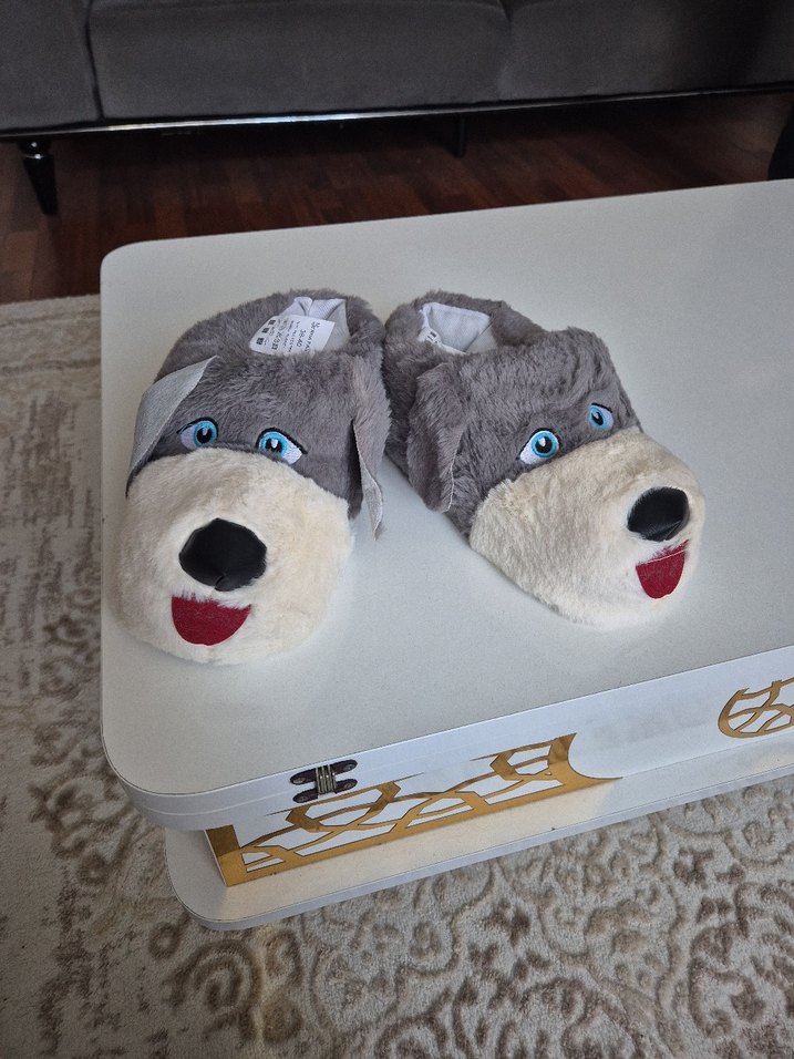 Gri peluş erkek ev terliği, sevimli köpek yüzü baskılı ve kürk detaylı, sıcak tutar.