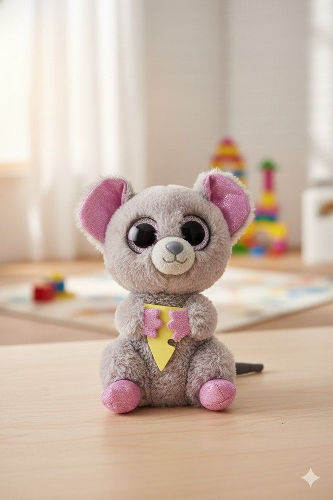 Yumuşak gri peluş fare, pembe kulak ve patileriyle sarı peynir parçası tutuyor. Sevimli ve kucaklanabilir oyuncak.