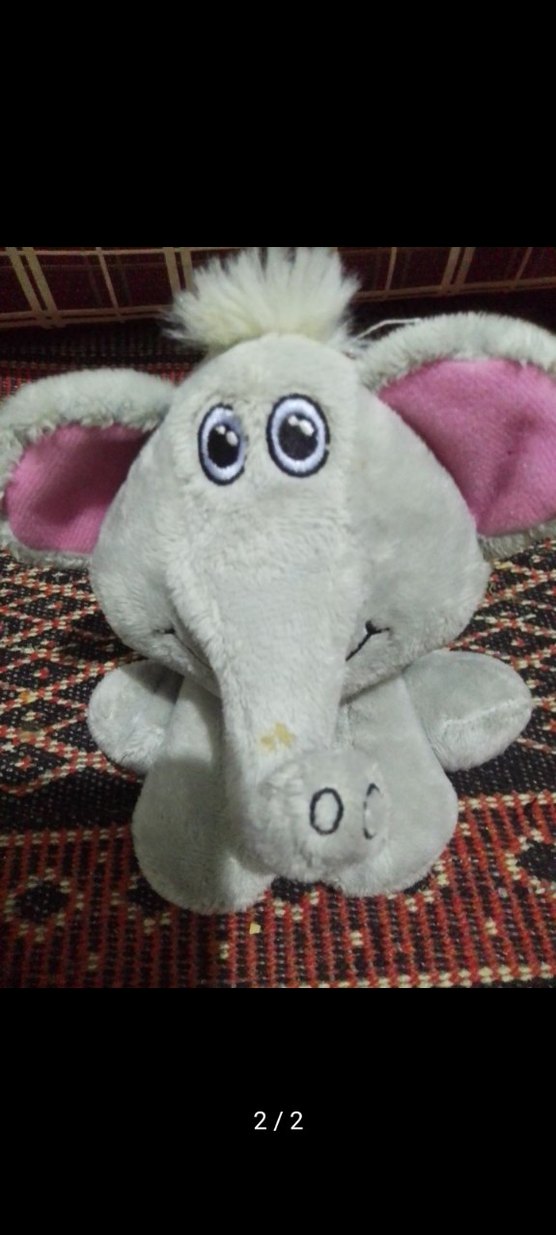 Büyük gözlü, pembe kulak içi detaylı yumuşak kumaştan gri peluş fil oyuncak.