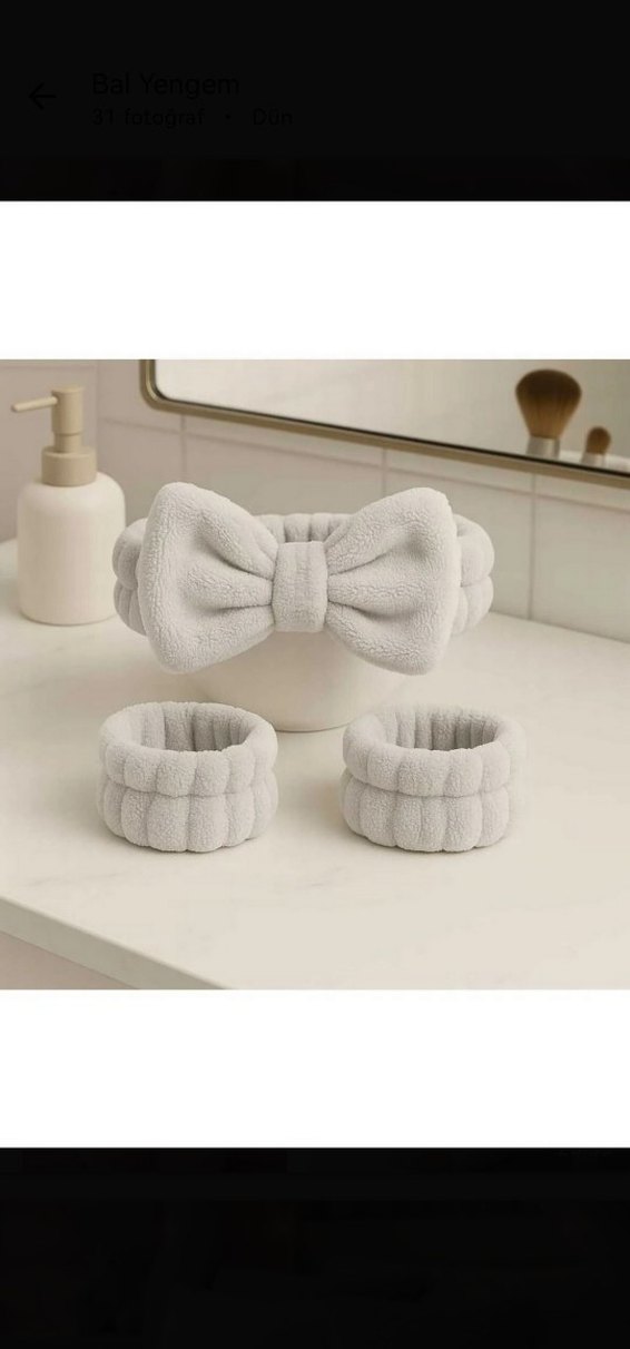 Yumuşak peluş malzemeden yapılmış, fiyonk detaylı gri saç bandı ve iki uyumlu bileklikten oluşan set. Rahat tarz için uygun. Suyu emici özelliğe sahip bilekliği yüzünüzü yıkarken suyun dirseklerinize akmasını engeller