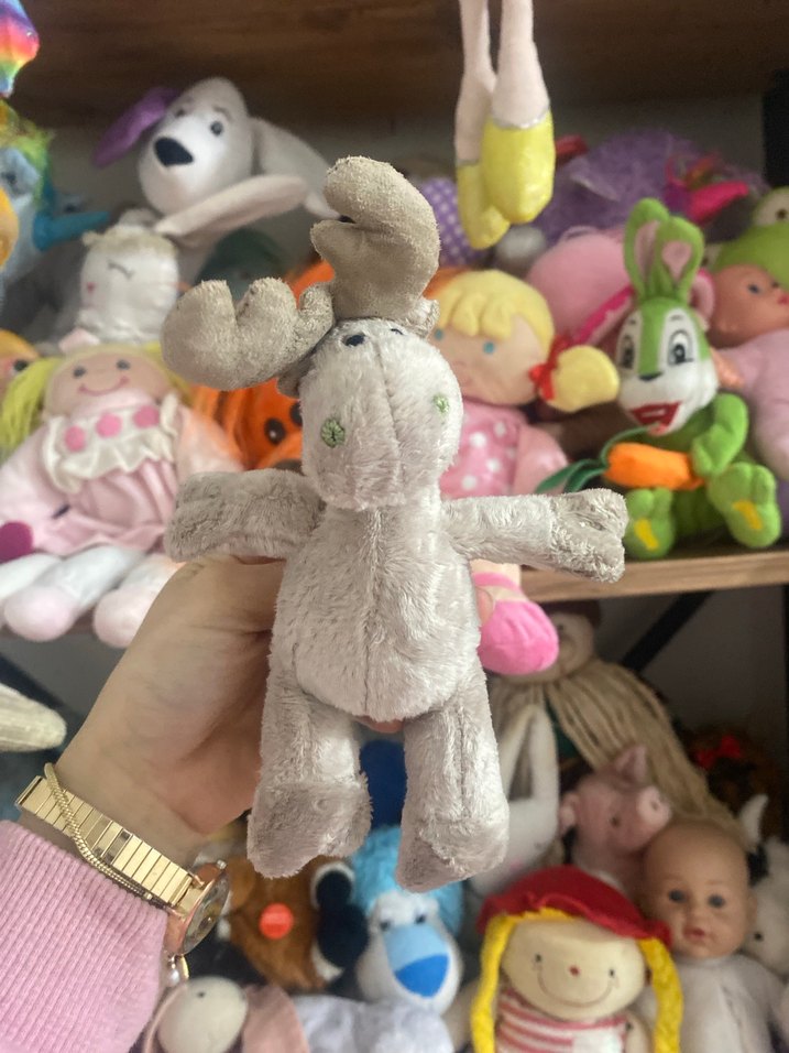 Yumuşak dokulu, detaylı boynuzlara sahip gri peluş geyik oyuncak.