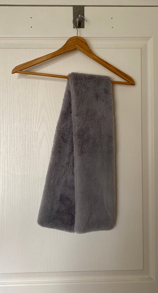Gri renkte, yumuşak ve konforlu peluş dokulu kadın atkısı, günlük kullanıma uygun sade ve desensiz tasarıma sahiptir.