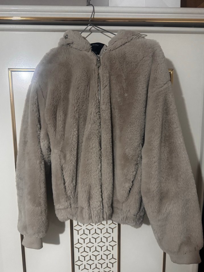 Uzun kollu, kruvaze yakalı gri kadın ceket. Peluş detaylı, rahat kesimli ve midi boyda. Fermuarlı, 'LYIYIY' yazılı. Sokak stiline uygun.