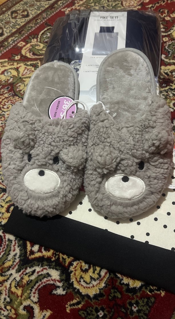 Gri peluş kadın ev terliği, nakışlı ayı detayları ve dolgu topuklu yapısıyla rahat ve şık bir tercih.