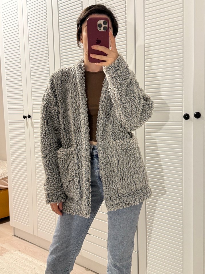 Gri renkli, uzun kollu ve rahat kesim midi ceket.Oversize