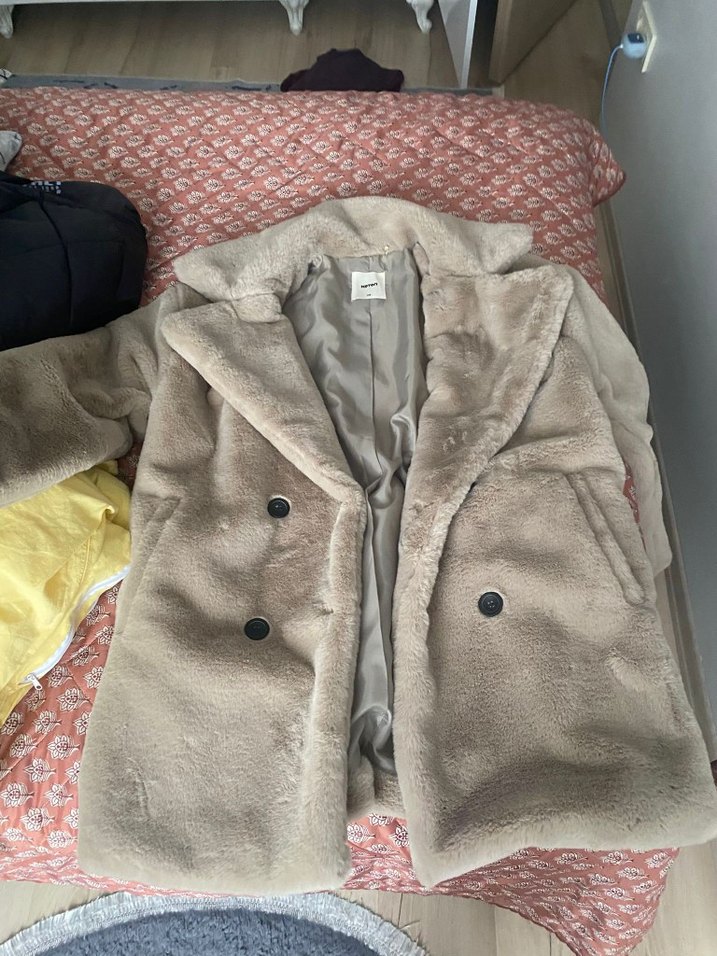 Gri renkte, peluş detaylı, notched lapel yakalı, midi uzunlukta kadın kaban. Bol kesim ve uzun kolludur, günlük rahat kullanım için uygundur.