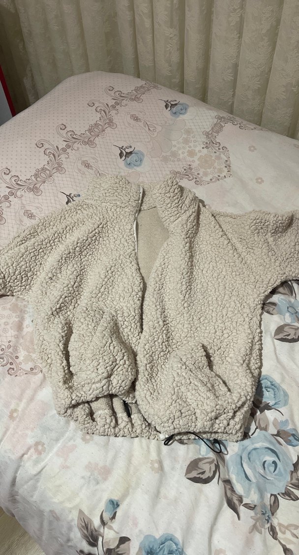 Kadınlar için gri, peluş detaylı, bol kesim ve boğazlı mont. Uzun kollu ve kısa boylu, günlük rahat sokak stili için uygun.