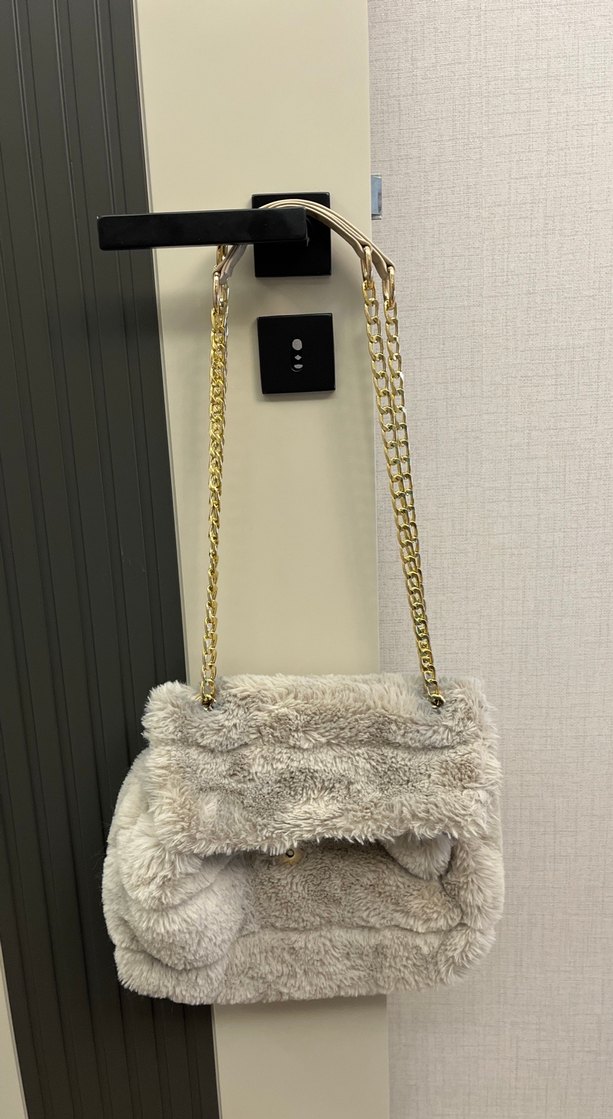 Yumuşak gri peluş malzemeden yapılmış, kürk detaylı ve altın zincir askılı kadın omuz çantasıdır.