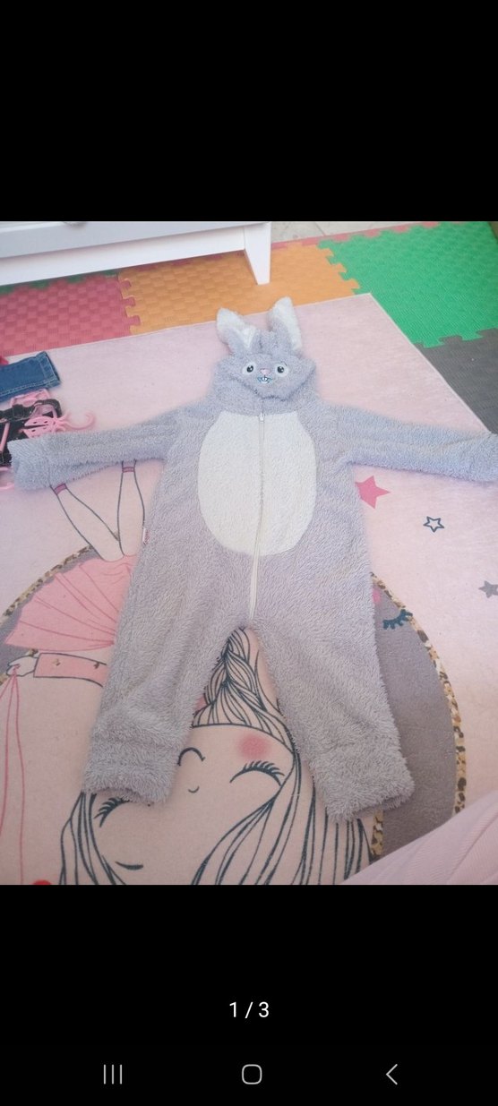 Yumuşak ve tüylü gri kedi kostümü, kapüşonunda kulaklar ve beyaz göbek detayı bulunur. Rahat ve sıcak tutar.